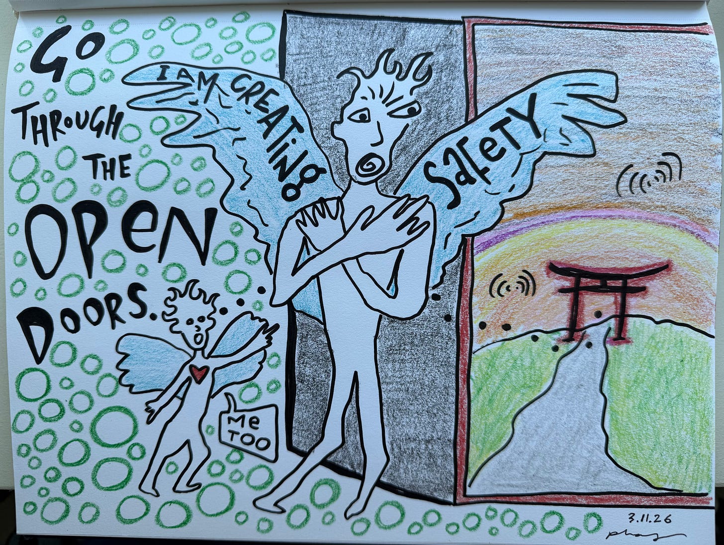 What if it’s about me becoming a safe place for myself? I’m creating safety, I keep reminding myself. Another theme from my somatic work. I’m bearing witness and integrating disparate parts. Letting them oscillate and reveal themselves in turn, until they begin to cohere and coalesce. Even when it doesn’t look or feel like I’m making much headway yet, that’s the work I’m doing. Creating safety where it wasn’t before. And my inner kid? Little Play? They’re buying in. We’re in this together. Going through the open doors.